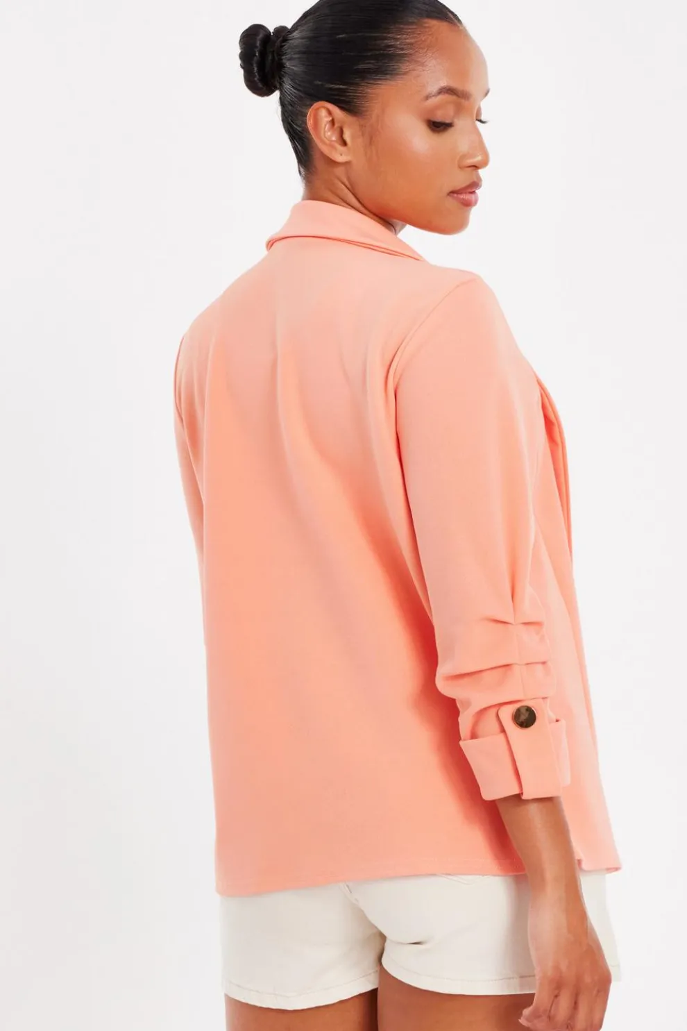 - Ruched sleeves